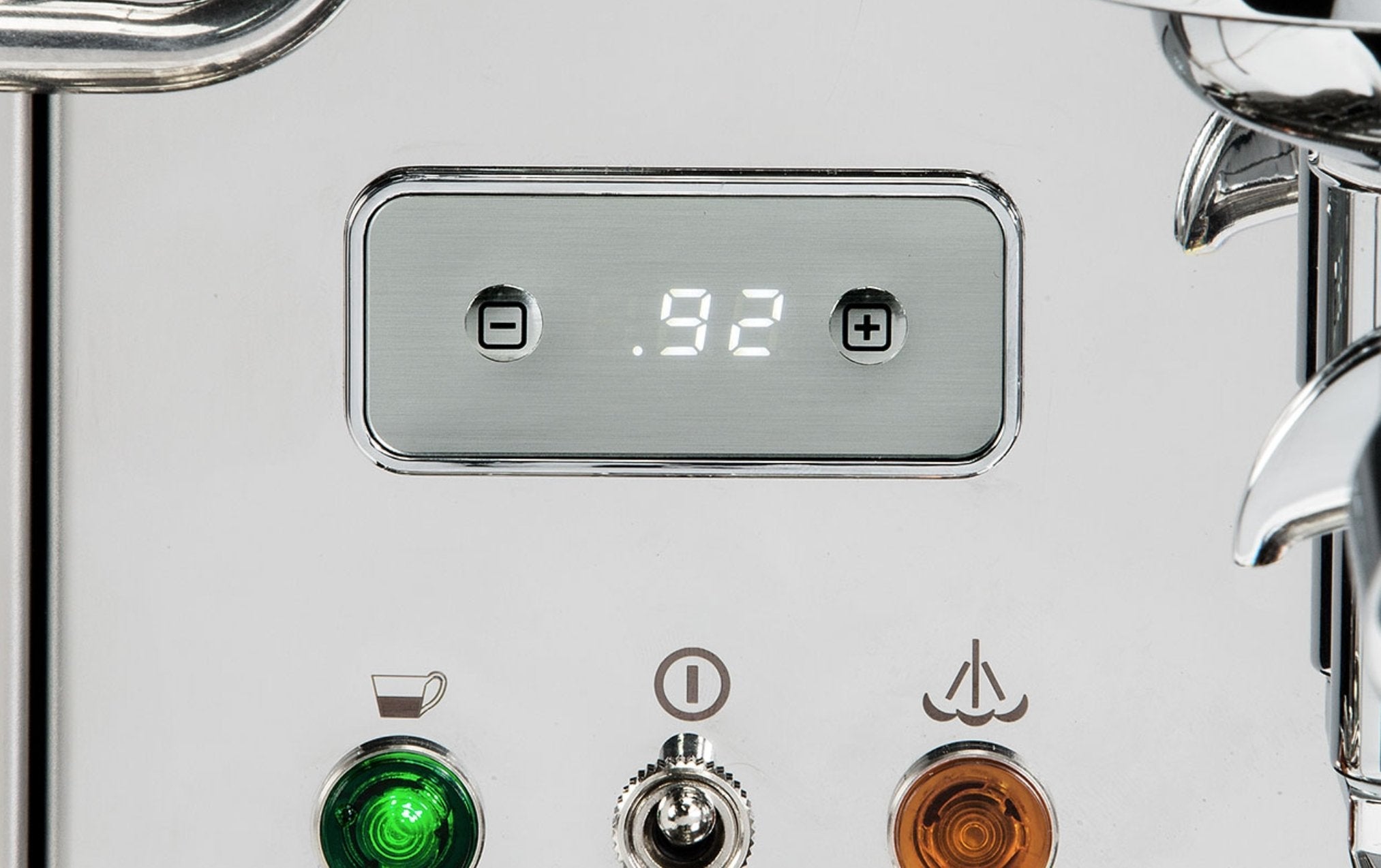 - Διακριτική, ασημί οθόνη PID για ατομική ρύθμιση θερμοκρασίας και εμφάνιση χρόνου ροής εσπρέσο