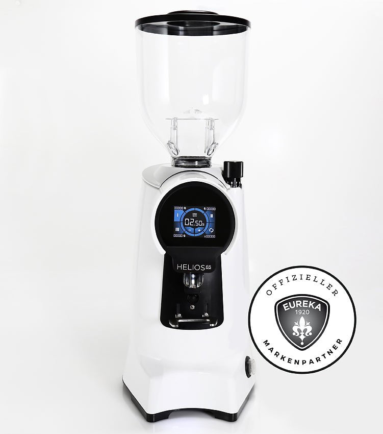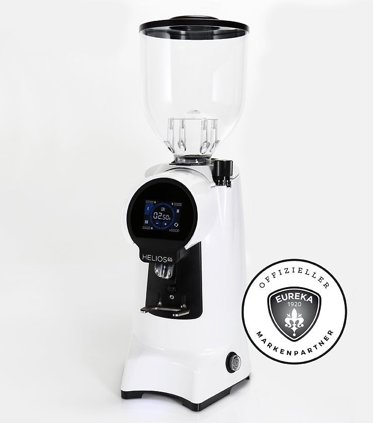 La Eureka Helios 65 es uno de los dos nuevos molinillos de café de alta rendimiento bajo demanda de Florencia. Además de su llamativo diseño moderno, el molinillo destaca sobre todo por sus notables características de rendimiento. Puede moler hasta 4,5 g de café en un segundo. A través de la pantalla táctil multicolor se pueden seleccionar diversas funciones a través del menú. Así, se puede, entre otras cosas, configurar un aviso de servicio para el cambio de las muelas. Tres ajustes de porción programables y el contador digital de dosis con una precisión de una centésima de segundo hacen que el trabajo del barista sea aún más fácil y preciso. La salida ajustable y extraíble, junto con el portafiltro ajustable de forma variable, aseguran que el café molido caiga perfectamente en los diferentes portafiltros. La HELIOS 65, con su gran diseño y sus impresionantes características de rendimiento, es un imprescindible para cualquier "cafetero" que valore la comodidad y el máximo rendimiento.