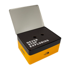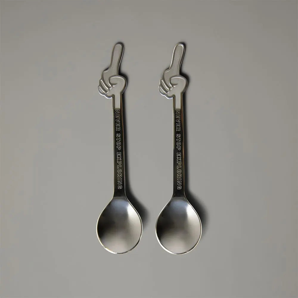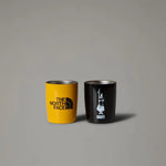 Due tazze in acciaio inox (giallo e nero) incl. cucchiaio con il mantra iconico "Never Stop Exploring"